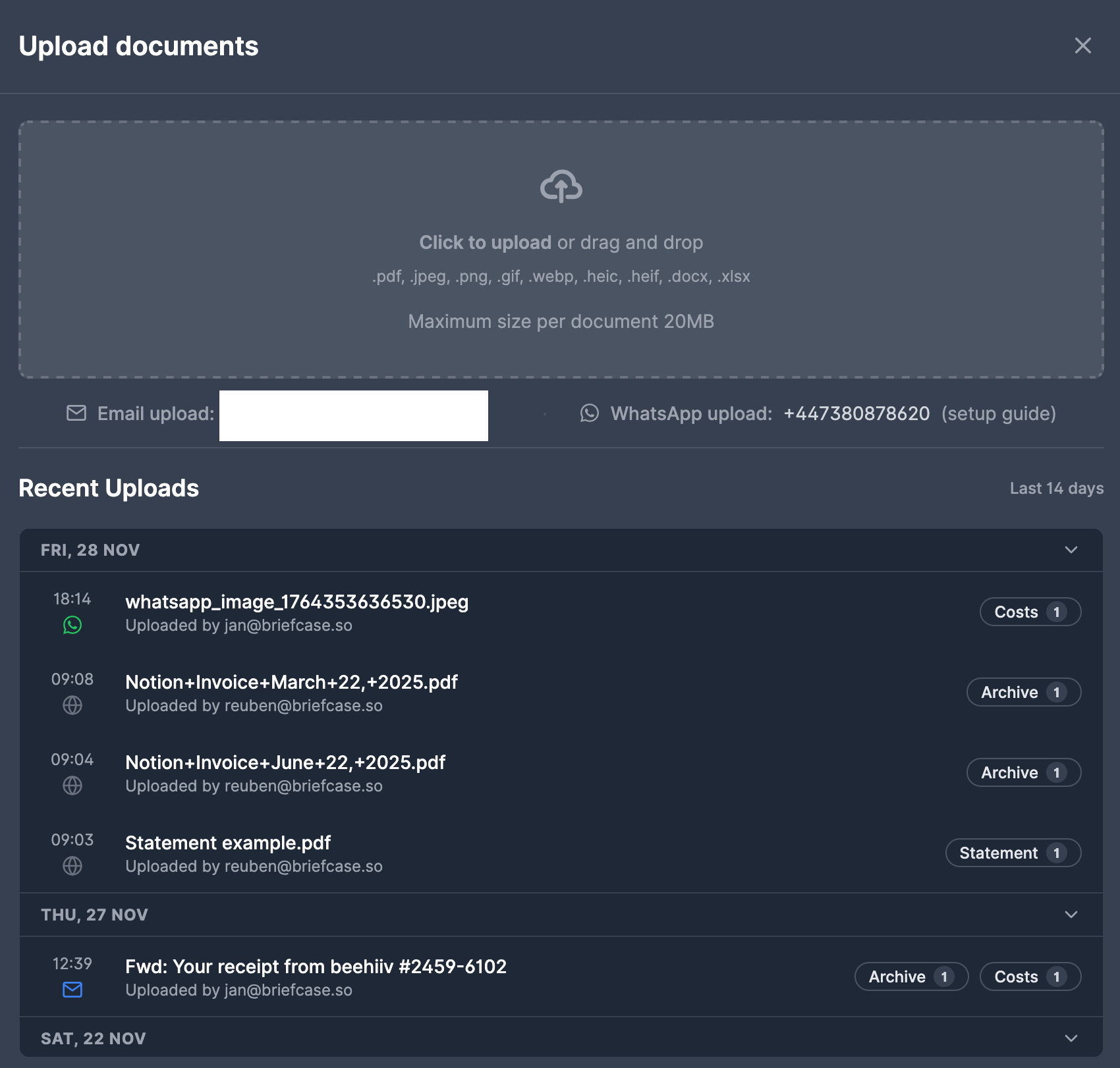 Briefcase now displays the last 14 days of uploads in the Upload Documents modal, making it easier to track recent document activity. This feature works seamlessly across all upload methods: web, WhatsApp, and email. Plus, you can quickly access your client's unique email address and WhatsApp (WA) setup guide right there.