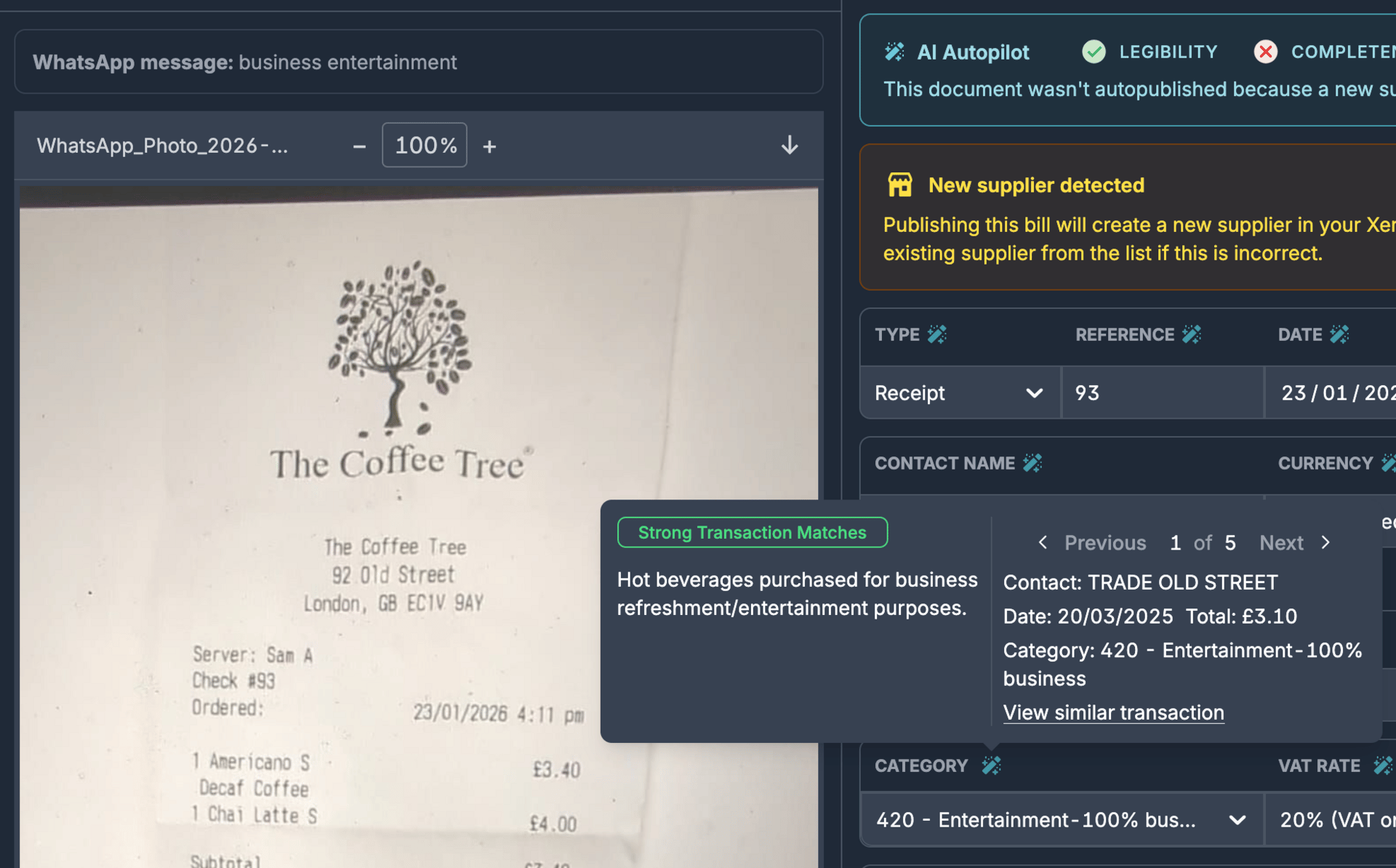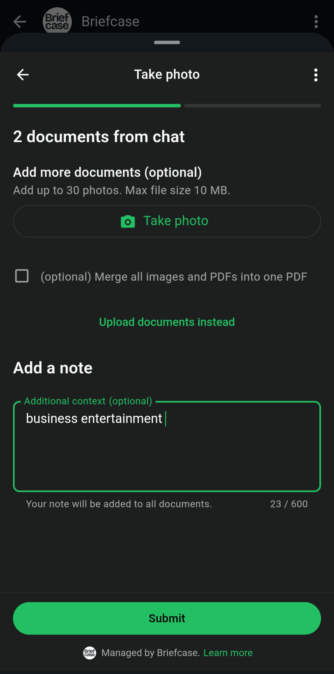 To guide Briefcase, simply enter an extra note in WhatsApp (here we tell Briefcase that the expense is business entertainment):