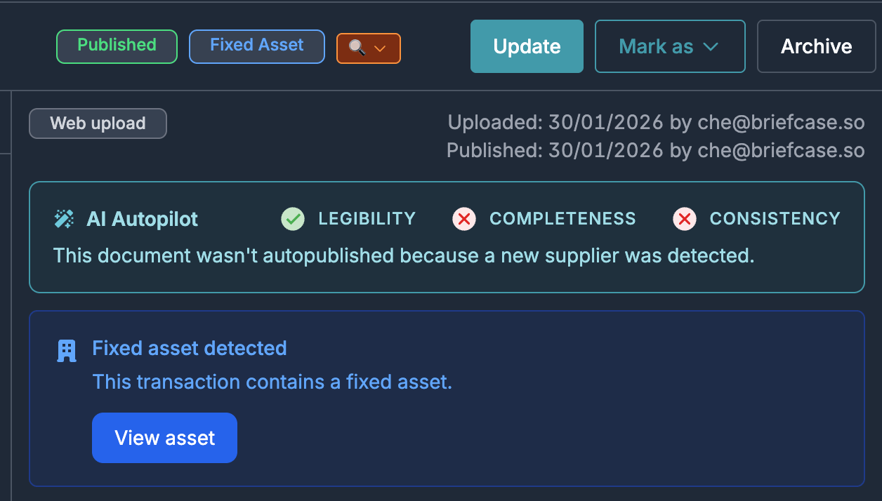 Upload your invoices via any channel as usual, and Briefcase will analyse them for fixed assets. Once a fixed asset is identified, it will be prominently displayed alongside the transaction details.